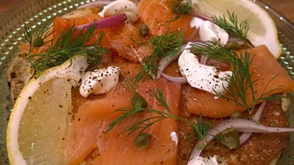 Asettele vielä lämmin blini tarjoiluastialle ja asettele täytteet haluamallasi tavalla blinille. Tarjoile!