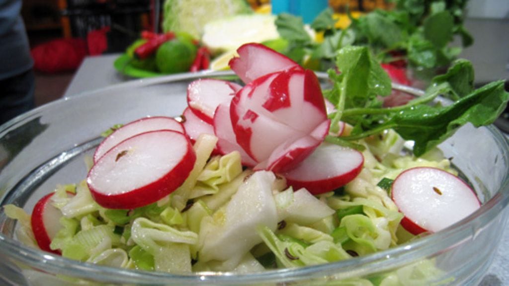 Valmista liha-, kala- ja kanaruokien kevyeksi lisäkkeeksi maistuvaa ja kesäistä varhaiskaalisalaattia. Helppo salaatti jätetään tunniksi kylmään vetäytymään ennen tarjoilua.