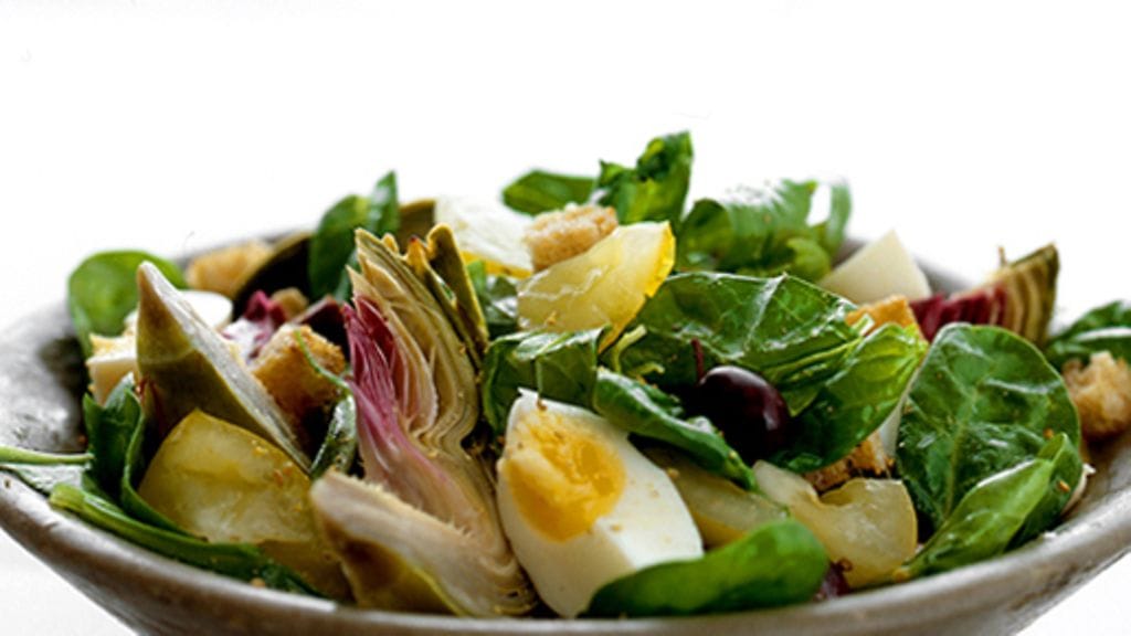 1. Kuutioi perunat karkeasti. Kuori ja suikaloi punasipuli. Sekoita perunat, sipuli, pinaatti ja latva-artisokat suuressa kulhossa. Kuori ja lohko munat ja asettele päälle.