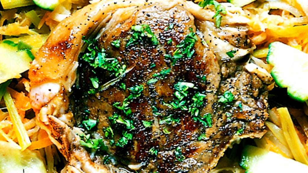 3. Hauduta kyljyksiä hitaasti kannen alla kunnes vihannekset ovat puoliksi pehmenneet ja liha kypsää, n. 10-15 minuuttia. Koristele kurkkuviipaleilla ja persiljalla.