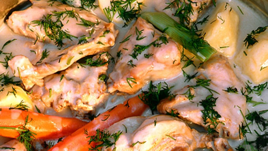 2. Ruskista lihakuutiot öljyssä pienissä erissä. Siirrä lihat pataan. Kaada joukkoon viini ja keitä kannen alla noin tunti. Lisää vihannekset keittoajan puolivälissä.