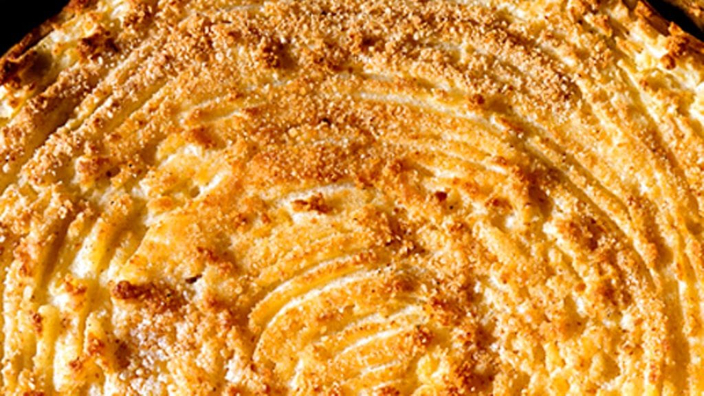 2. Muussaa perunat kulhossa. Lisää munat, voi, kerma, sekoita ja mausta. Kaada seos kevyesti voideltuun uunivuokaan. Sihtaa päälle hieman korppujauhoja.