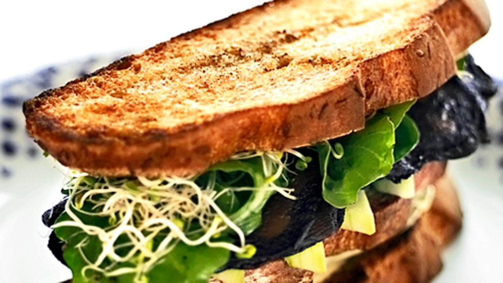 3. Paahda leivät molemmilta puolilta. Viipaloi kurkku ohuelti ja vinosti. Halkaise avokado, poista siemen ja viipaloi malto. Laita työpöydälle neljä leipäviipaletta ja voitele ne majoneesilla. Jaa avokadosiivut ja sirottele päälle juustoraastetta. Voitele neljä leipäviipaletta majoneesilla molemmilta puolilta ja laita sandwichien päälle. Laita päälle vielä rucolaa, kurkkua, portobellosuikaleita ja ituja. Laita vielä päälle viimeiset leipäsiivut, paina kevyesti ja tarjoile.