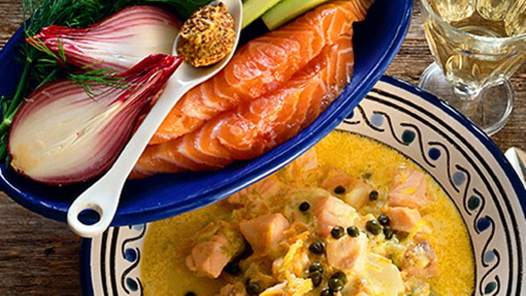 3. Lisää lohipalat, purista joukkoon valkosipulinkynsi ja mausta kapriksilla ja suolalla. Kiehauta ja anna poreilla sen aikaa, että lohi on kypsä.
