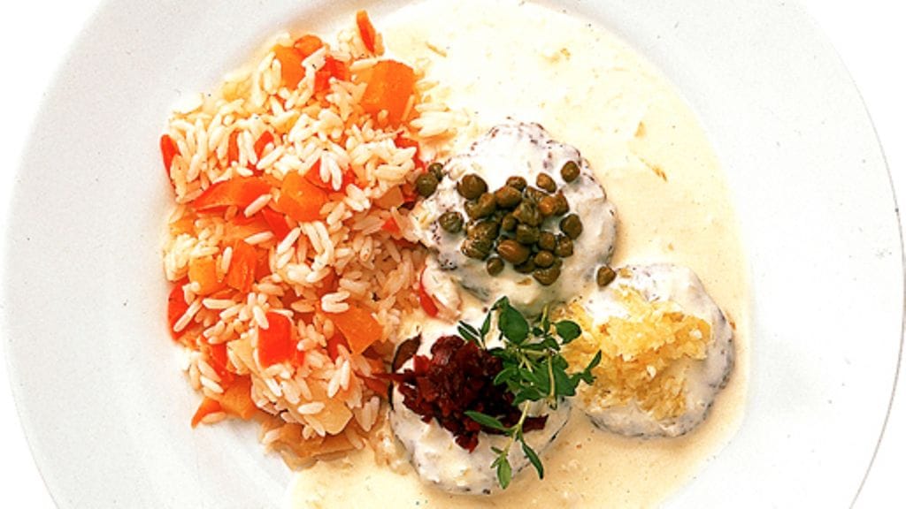 3. Murusta leipäviipaleet, kaada maito murujen päälle. Raasta mukaan sipuli. Lisää jauheliha, suola, pippuri ja jauhettu muskotti, sekoita. Muotoile 12 litteää lihapullaa ja paista niitä 2-3 minuuttia molemmin puolin. Tarjoile vihannesriisin kera, kaada kastiketta ympärille.