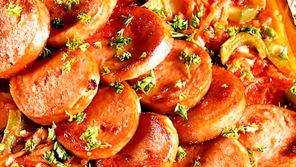 3. Poista folio, laita viipaloitu makkara gratiinin päälle ja paista vielä 10 minuuttia. Ripottele päälle persiljaa.