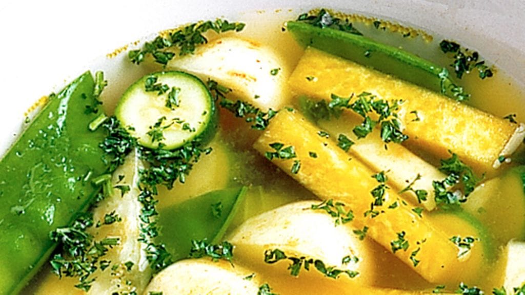2. Kuori sipuli ja lohko se. Kuori porkkana ja selleri ja pieni ne. Puhdista purjo ja leikkaa vihreä osa paloiksi. Laita vihannekset kattilaan ja kaada vihanneslientä päälle, niin että ainekset peittyvät. Kuumenna kiehuvaksi ja lisää suola ja valkopippurit. Keitä hiljaa kannella peitettynä, kunnes vihannekset ovat pehmeitä, noin 15 minuuttia.