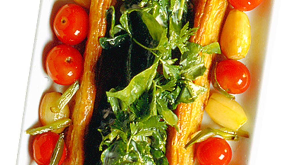 2. Kuori ja hienonna salottisipuli. Keitä kermaa kokoon sekoittaen, kunnes nestettä on kolmannes alkuperäisestä määrästä. Vatkaa joukkoon voi, sinappi, suola ja cayennepippuri ja lisää viimeiseksi salottisipuli. Huuhtele persilja ja irrota lehdet. Huuhtele pinaatti ja poista paksut varret. Kuori sipulit. Lämmitä ½ rkl öljyä isossa kattilassa ja ravistele helmisipuleita öljyssä. Lisää tilkka vettä ja keitä 5-7 minuuttia kannen alla. Mausta suolalla ja vastajauhetulla valkopippurilla. Lisää tomaatit ja kiehauta seos nopeasti, älä keitä.