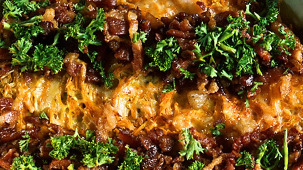 2. Paista kypsäksi uunin keskitasolla n. 15-20 minuuttia. Hienonna sillä aikaa pekoni ja paista rapeaksi. Laitaa pekonit gratiinin päälle kun otat vuoan uunista, ripottele päälle persiljaa.