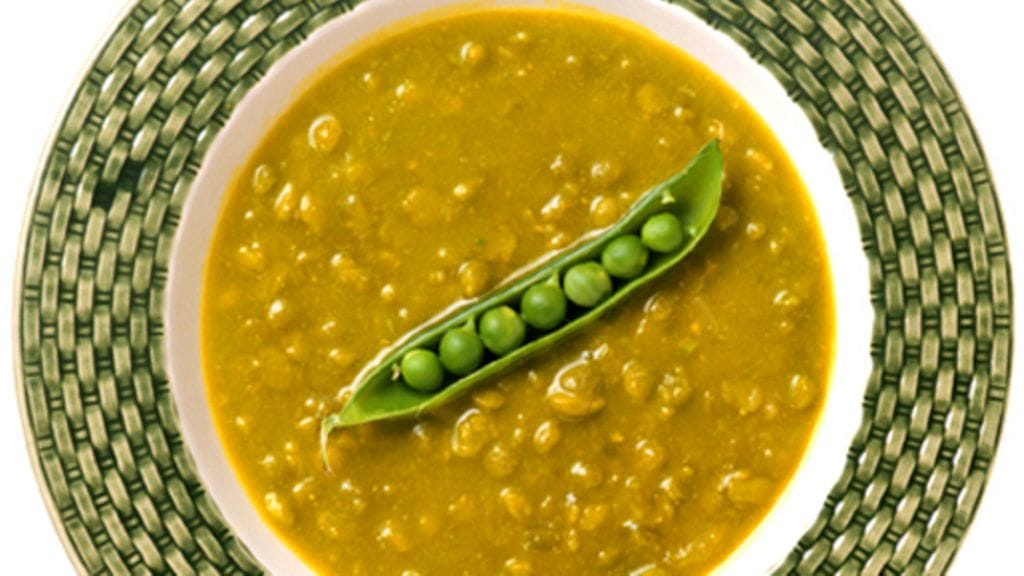1. Kuori ja hienonna sipuli, paista voissa. Lisää herneet, liemi, viini ja kerma, keitä 5 minuuttia.