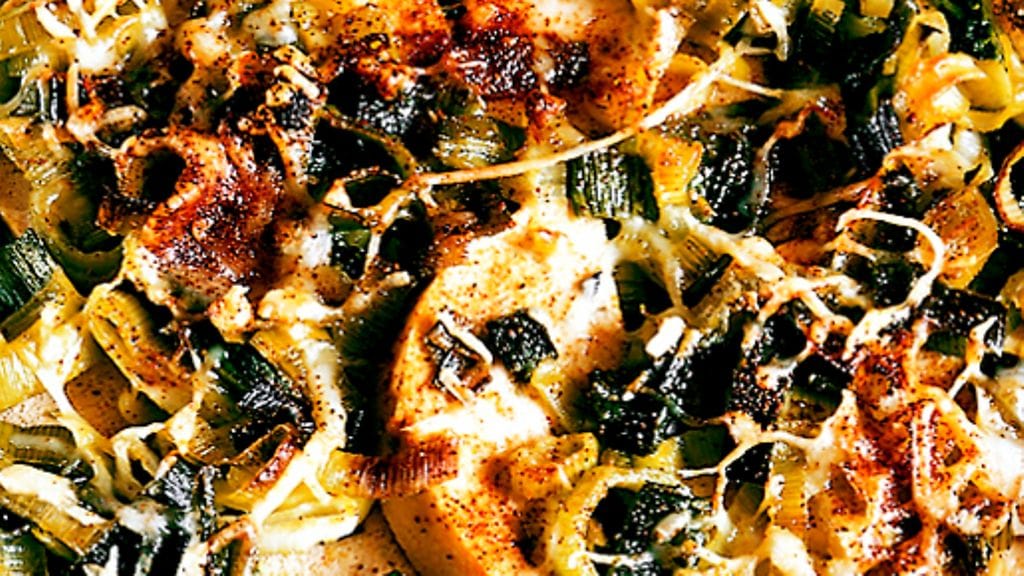 2. Viipaloi purjo, peitä mäti purjoviipaleilla ja ripottele päälle juustoraastetta.