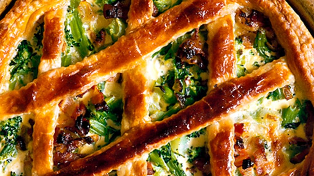 3. Kauli taikina ja vuoraa sillä piirasvuoka. Säästä hieman taikinaa koristeluun. Pistele pohja ja Levitä sille parsakaalin kukinnot ja sipuli-pekoniseos. Vatkaa yhteen munat, kerma ja juustoraaste ja kaada piiraan päälle. Leikkaa taikinapyörällä nauhoja ja tee niistä ristikko piiraan päälle. Voitele vispatulla munalla ja paista uunin keskitasolla noin 30 minuuttia.