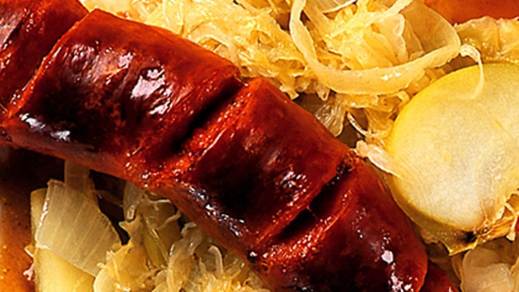 3. Nosta laakerinlehdet ruoasta ja jaa hapankaaliseos lämpimille lautasille, nosta makkara jokaiseen annokseen. Tarjoa keitettyjä perunoita ja vahvaa sinappia lisäksi.