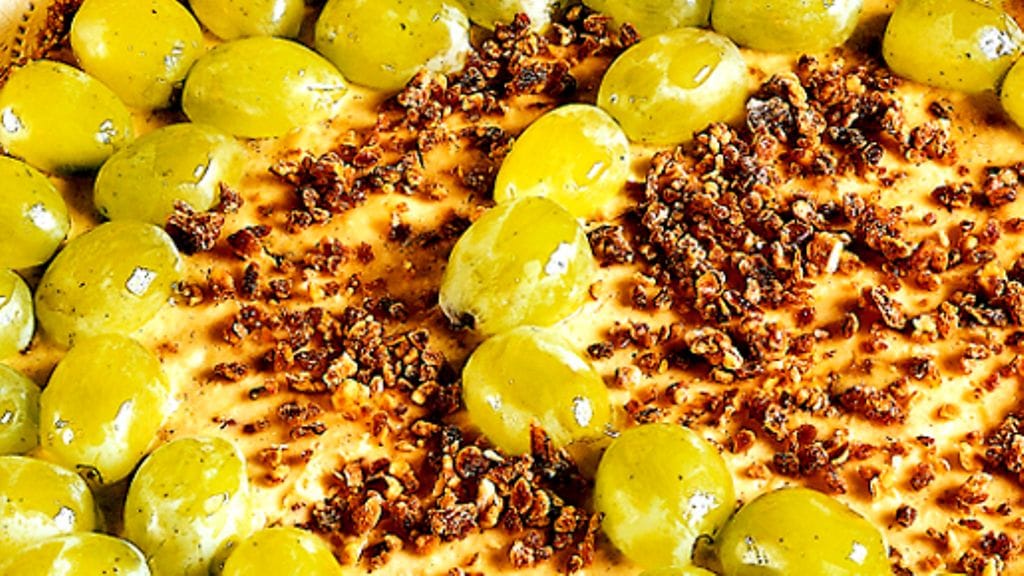 3. Jäähdytä kakku ja koristele halkaistuilla viinirypäleillä ja suklaarouheella.