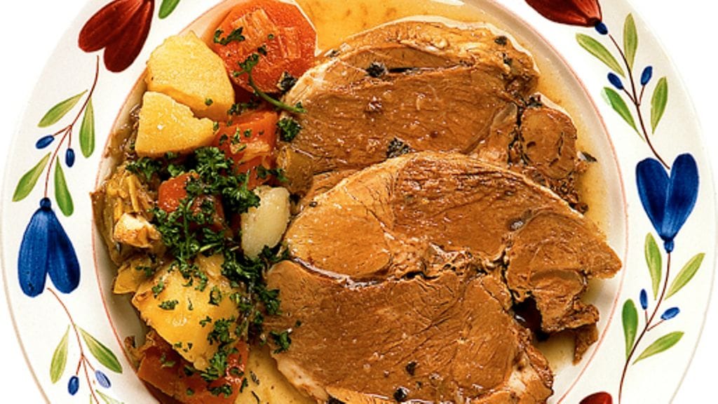 3. Kaada päälle viini ja noin neljä desilitraa vettä. Kiehauta, pietä kannella ja hauduta miedolla lämmöllä tunti ja 40 minuuttia. Kaada pataan lisää viiniä tai vettä, jos se näyttää kiehuvan kuiviin. Nosta paisti leikkuulaudalle ja viipaloi se vasta pöydässä. Tarjoile vihannekset ja herkullinen keitinliemi lisukkeina.