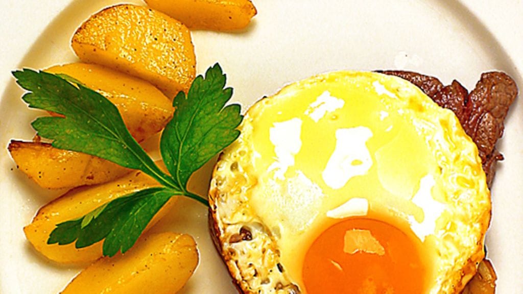 3. Laita lihaviipaleet lämpimille lautasille. Levitä päälle paistettua sipulia ja asettele paistettu muna päällimmäiseksi. Tarjoile paistettujen perunoiden kera.