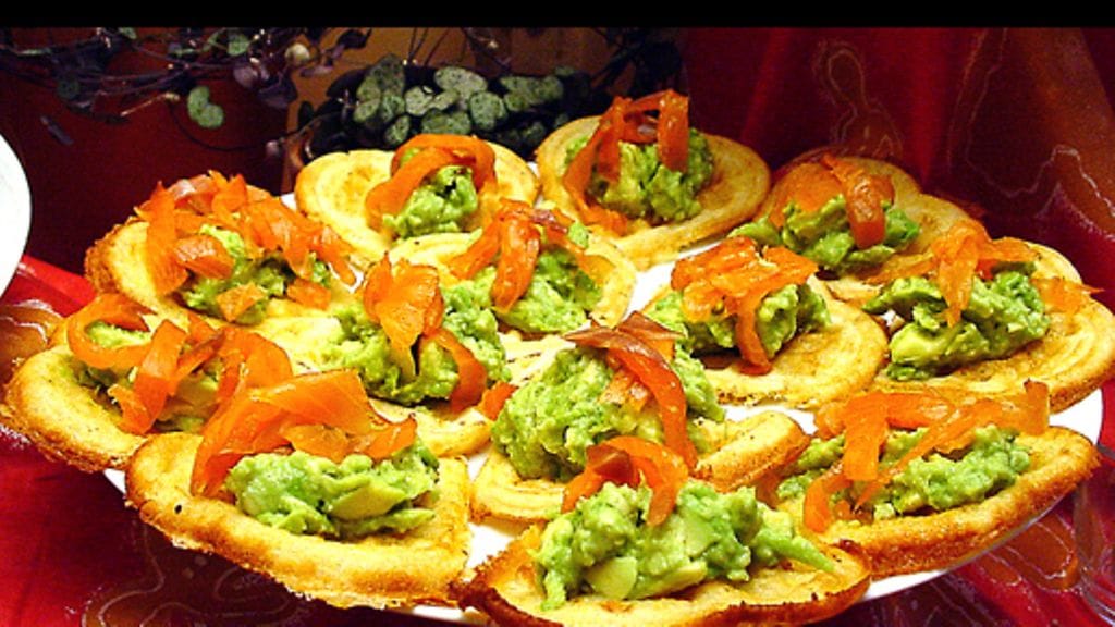 3. Laita jokaiselle vohvelisydämelle ruokalusikallinen avokadoseosta. Koristele puolikkaalla lohiviipaleella.