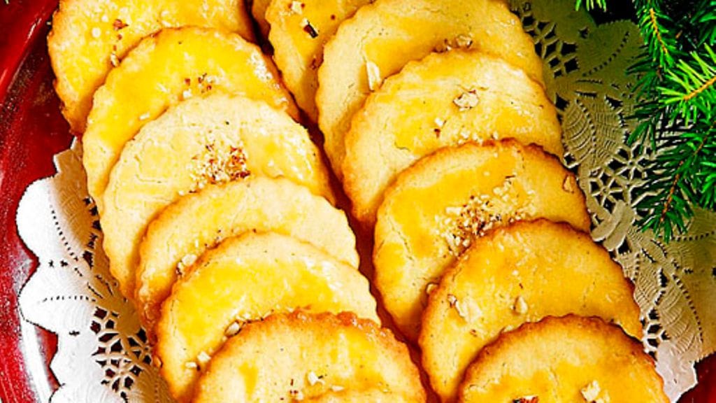 3. Kuumenna uuni 225 asteeseen. Kaulitse taikina pala kerrallaan ja ota siitä muotilla pyöreitä paloja. Laita ne leivinpaperille pellille, penslaa munanvalkuaisella ja ripottele päälle mantelirouhetta. Paista uunissa 8-10 minuuttia.