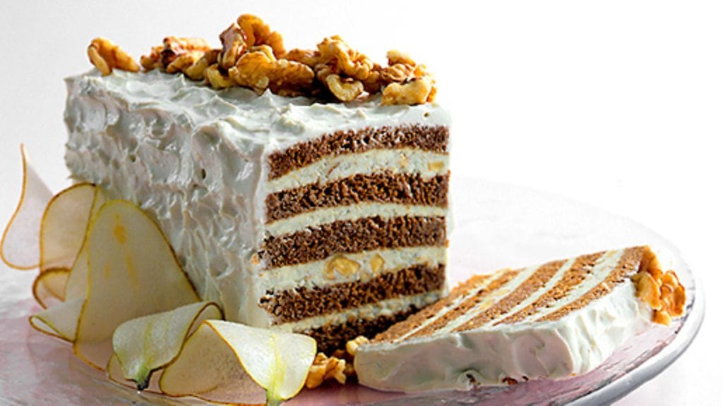 3. Levitä Philadelphia-juustoa kakun sivuille. Paahda pähkinät kuivassa, kuumassa pannussa. Koristele kakku pähkinöillä.