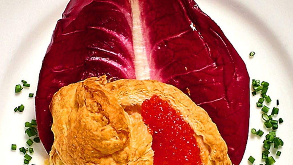 3. Täytä voitaikinaleivokset lohiseoksella. Leikkaa kaksi viimeistä lohiviipaletta puoliksi, kääri ne ruusukkeiksi. Asettele lautaselle salaatinlehti, leivos, lohiruusuke. Koristele ruohosipulilla, tillillä ja piparjuurella.
