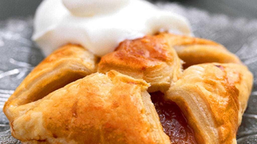 1. Kuumenna uuni 225 asteeseen. Sulata voitaikinalevyt, leikkaa ne kahtia ja kaulitse n. 15X15 cm neliöiksi.