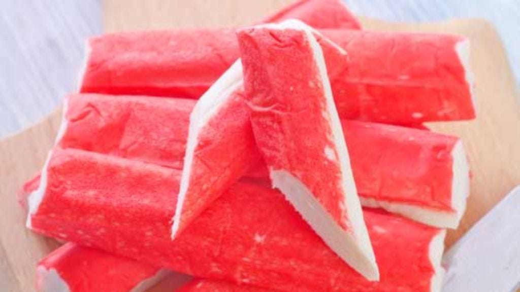 1. Kuumenna uuni 200 asteeseen. Kuori ja hienonna sipuli, viipaloi herkkusienet ja suikaloi paprika. Säästä hieman paprikaa koristeluun. Kuumenna hieman öljyä kattilassa, lisää sipuli, paprika ja herkkusienet, paista hetki. Lisää tomaattimurska ja mausteet, kuumenna kiehuvaksi. Leikkaa surimi pienemmiksi paloiksi ja lisää kattilaan, lämmitä mutta älä anna enää kiehua. Jäähdytä.