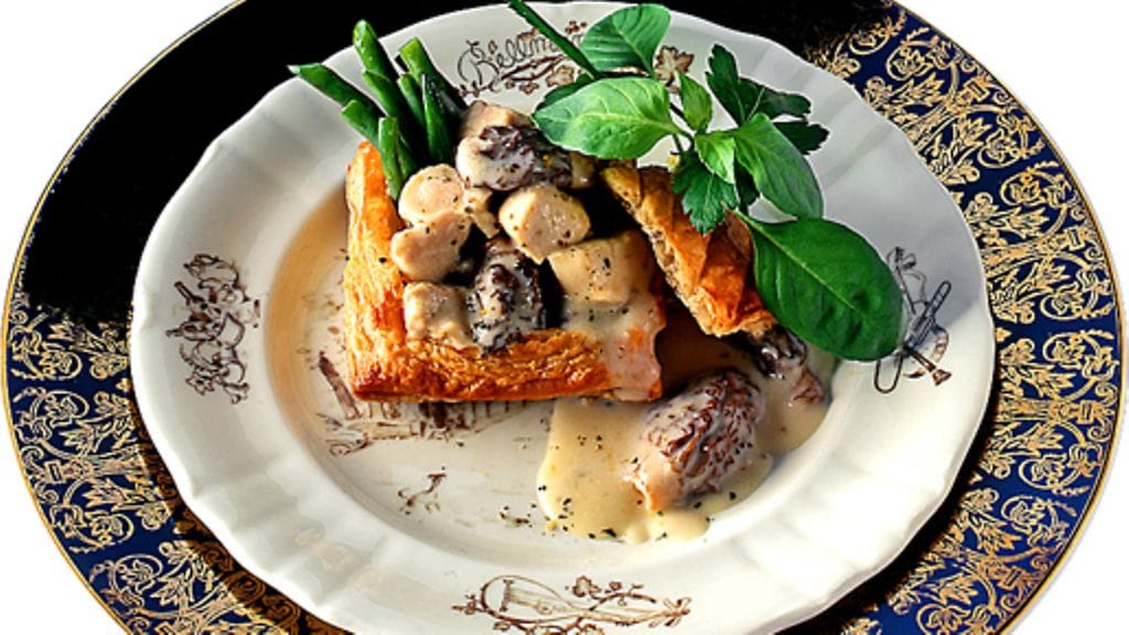 2. Täyte: Vaivaa voi ja jauhot yhteen beurre manié -suurukseksi. Kuutioi kana ja keitä paloja liemessä 3 minuuttia. Huuhtele kateenkorva kylmässä vedessä, keitä 4 minuuttia suolatussa vedessä. Puhdista pois jänteet ja suonet. Kuutioi kateenkorva pieniksi paloiksi. Viipaloi herkkusienet, paista voissa. Lisää kerma, kuumenna kiehuvaksi ja mausta suolalla ja pippurilla. Suurusta beurre maniélla. Lisää viini sekä hieman lientä kanan keittämisestä. Lisää kateenkorva ja kanapalat muhennokseen. Keitä vihreät pavut pehmeiksi kevyesti suolatussa vedessä. Näin pitkälle voit valmistella ruoan etukäteen.