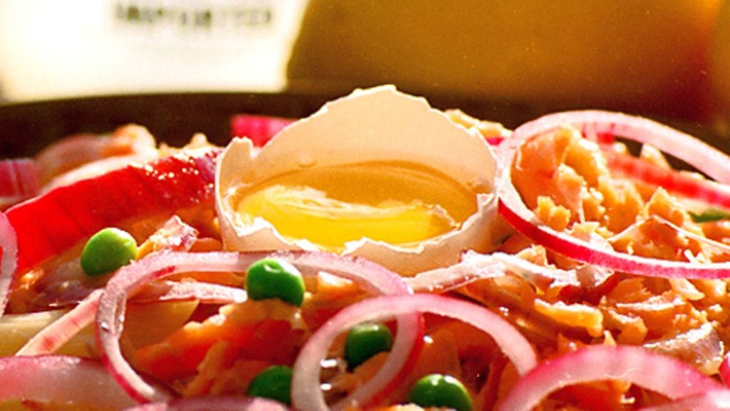 3. Sekoita yhteen pasta, lohikastike ja vihreät herneet. Jauha ruoan päälle mustapippuria ja tarjoile raaka keltuainen kullekin ruokailijalle.
