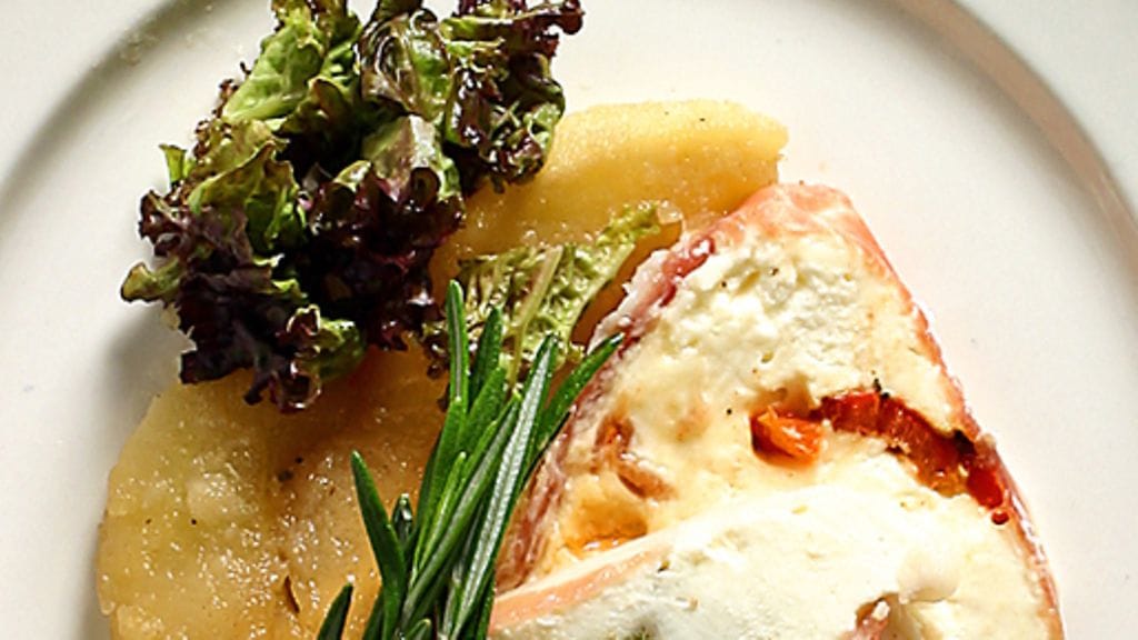 2. Pane liivatelehti likoamaan. Leikkaa chèvrejuustosta reunat ja raasta juusto karkeaksi raasteeksi. Sekoita juustoraasteeseen kerma ja ranskankerma. Purista liivatelehti kuivaksi ja sulata se varovasti miedolla lämmöllä. Kaada liivate juustoseokseen kokoajan sekoittaen niin, ettei seos paakkuunnu. Täytä vuoka kerroksittain juustoseoksella ja paprikasuikaleilla, taita kinkkusiivut pohjaksi, peitä tuorekelmulla ja pane jääkaappiin jähmettymään. Anna jähmettyä mieluiten yön yli.