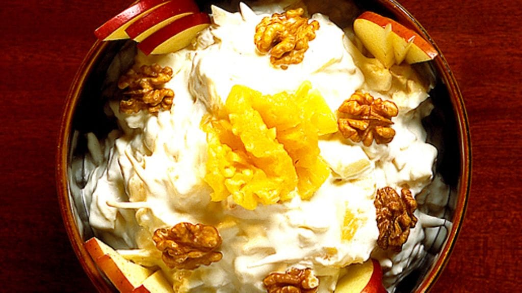 3. Rouhi pähkinät. Laita salaatti kulhoon ja koristele saksanpähkinöillä, ananaksella ja omenalla.