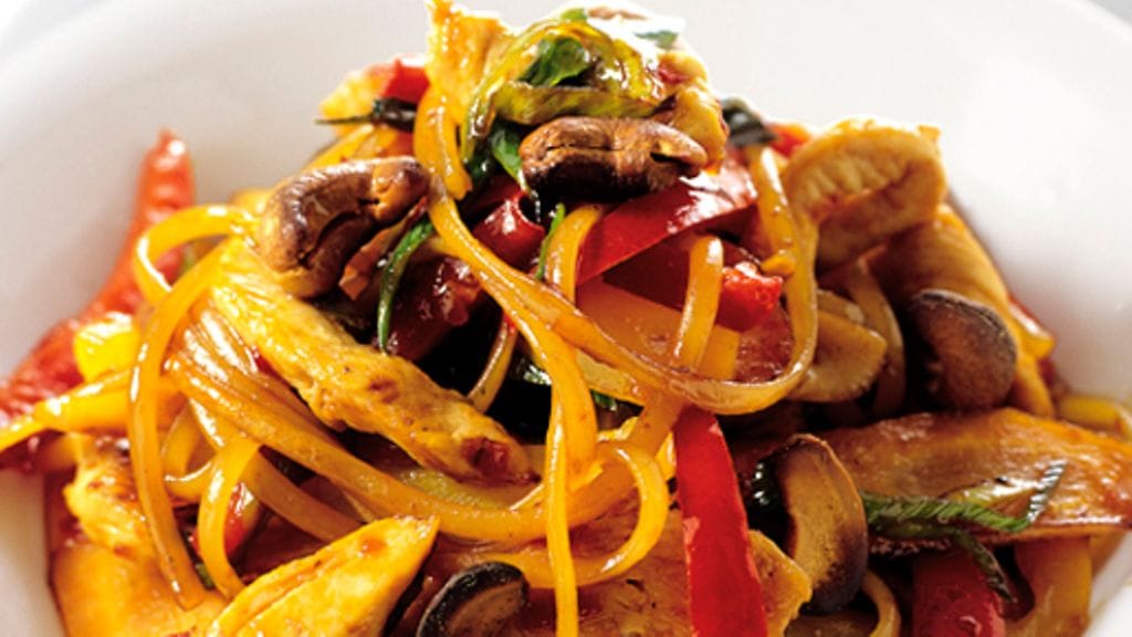 2. Puhdista ja suikaloi purjo, kuori ja viipaloi porkkana ja suikaloi paprika. Suikaloi broilerinfileet. Kuumenna wokkipannu, lisää tilkka oliiviöljyä ja wokkaa broilerisuikaleet.