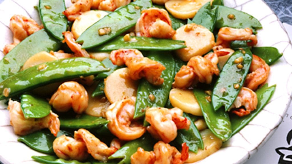 1. Kuori katkaravut, mutta jätä pyrstön uloin osa paikalleen. Valuta vesikastanjat ja viipaloi ne sitten ohuesti. Puhdista sokeriherneet. Kuori valkosipulinkynnet ja hienonna ne. Kuori ja raasta inkivääri hienosti.