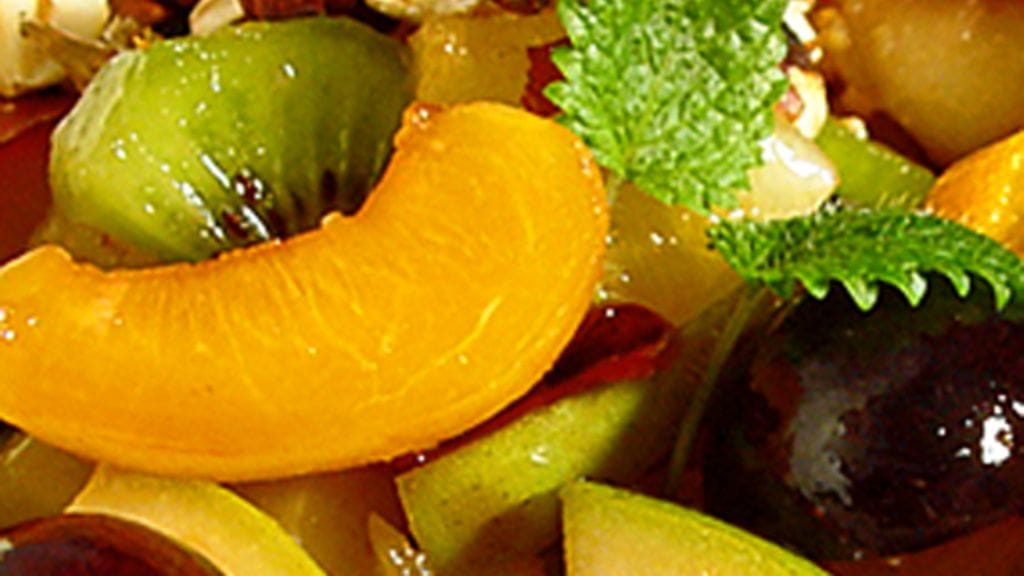 3. Kuumenna öljy wokkipannussa. Laita öljyn joukkoon inkiväärihake ja puolet fariinisokerista. Sekoita mukaan omena- ja päärynäpalat. Wokkaa sekoittaen vajaa minuutti. Lisää aprikoosit ja kumqvatit sekä loppu fariinisokeri. Anna hedelmien kuumeta kunnolla. Voit halutessasi lirauttaa vähän ananasmehua joukkoon. Sekoita mukaan viimeiseksi viinirypäleet. Sirottele päälle pähkinämuroja ennen tarjoilua.
