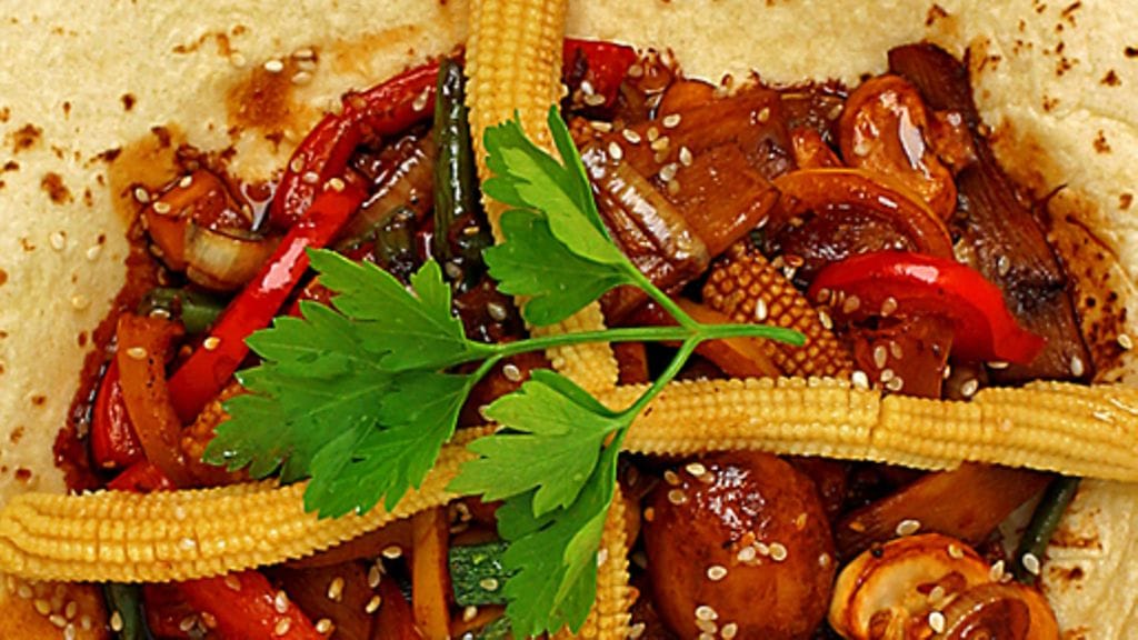 3. Sekoita soija, hunaja ja makea chilikastike. Lämmitä tortillat ja täytä vihannessekoituksella. Ripottele pinnalle paahdetut seesaminsiemenet ja kastike. Tarjoa heti.
