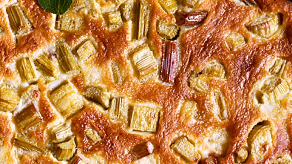 3. Ota vuoka uunista, poista folio. Sihtaa pohjalle korppujauhoja ja ripottele päälle raparperit. Paista edelleen uunissa kunnes raparperit ovat sulaneet, 10-15 minuuttia.