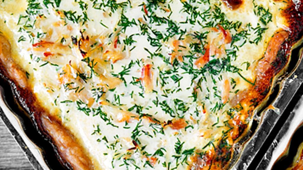 4. Vatkaa munat, kerma ja mausteet, kääntele mukaan ravunlihat ja tilli.