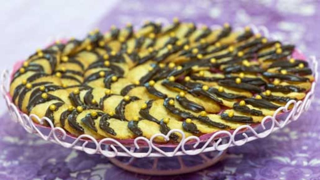 Kasta keksin reunat suklaassa ja laita kultahelmi lyyraksi.