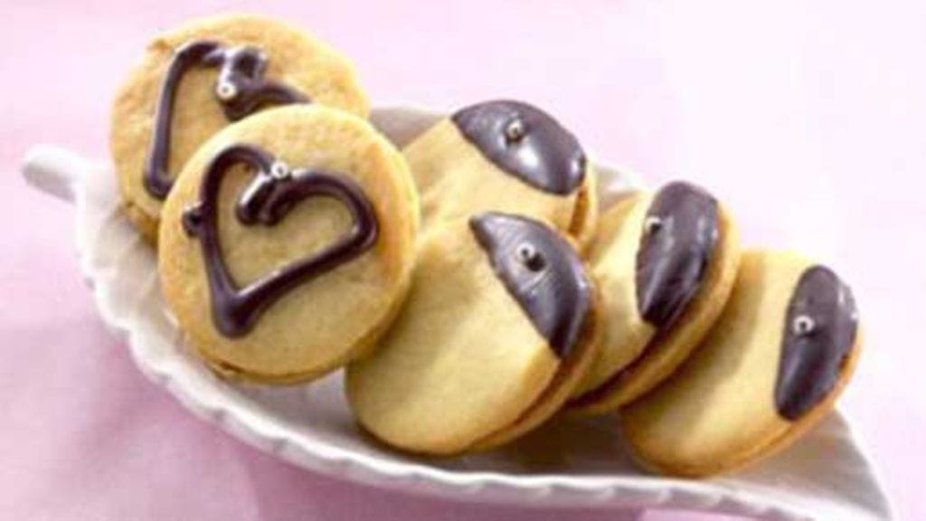 Sulata suklaa mikrossa tai vesihauteessa. Ota puolet pyöreistä kakuista ja kasta reuna suklaaseen. Voit laitaa reunaan hopeisen nonparellin "lyyraksi".