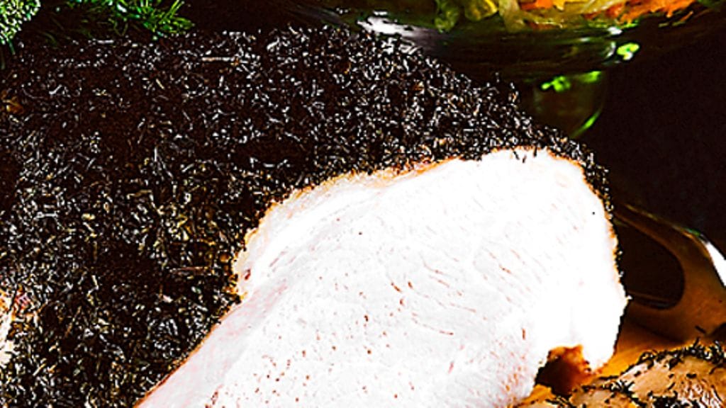 3. Jatka paistamista, kunnes mittari näyttää 70 astetta. Ota kinkku uunista ja anna sen jäähtyä täysin. Irrota verkko ja viipaloi kinkku. Tarjoile sekasalaattia lisäksi.
