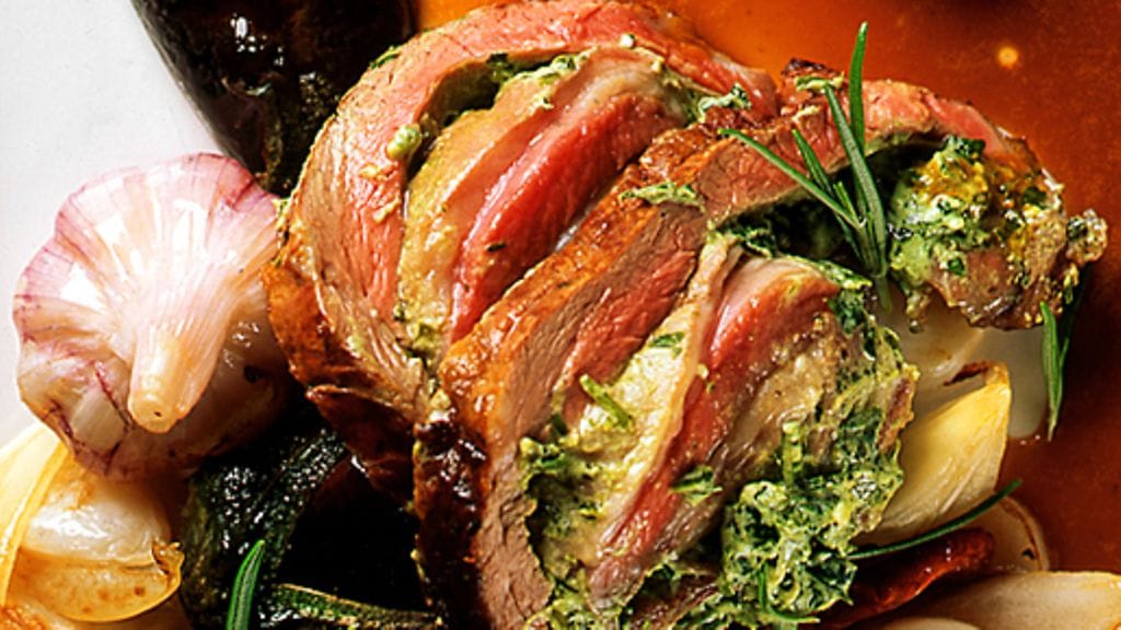 2. Huuhtele lampaanrinta, älä puhdista pois liikaa rasvaa. Levitä liha työlaudalle ja mausta se suolalla ja pippurilla. Levitä täyte lihan päälle ja kääri se napakalle rullalle. Sido huolellisesti kääryle paistolangalla. Ruskista lihakäärö kauttaaltaan voissa, siirrä se uunivuokaan ja paista uunissa 50-60 minuuttia.
