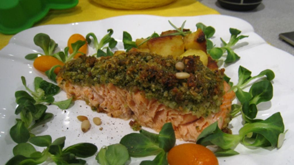 Sekoita joukkoon hunaja ja oliiviöljy, sekoita tasaiseksi. Taputtele kuorrute lohen pinnalle.
