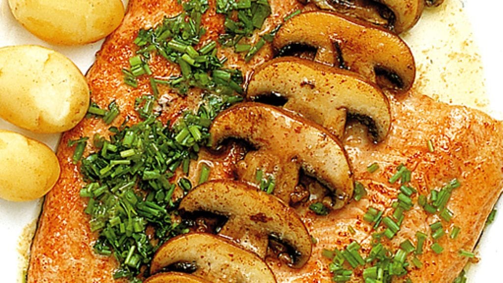 3. Paista herkkusieniviipaleet lopussa voissa ja mausta suolalla ja vastajauhetulla pippurilla. Asettele kalafileet ja herkkusienet tarjolle ja ripottele päälle hienonnetut yrtit.