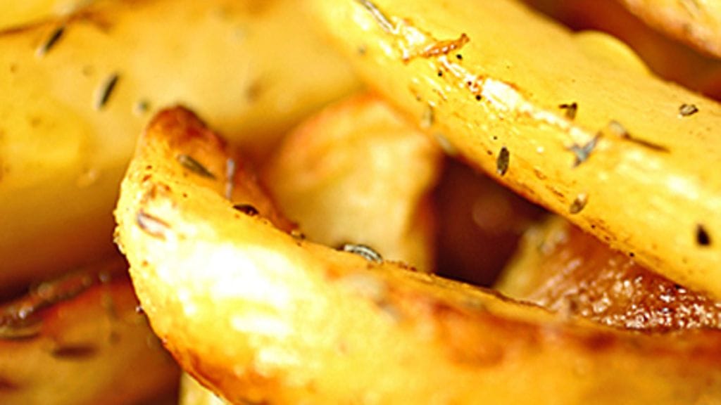 2. Kuumenna uuni 200 asteeseen. Kaada öljyä uuninkestävän vuoan pohjalle. Kaada perunoista vesi pois, laita perunat vuokaan. Paista uunissa n. 30 minuuttia. Ripottele päälle yrttimausteet, kun n. 5 minuuttia paistoajasta on jäljellä.