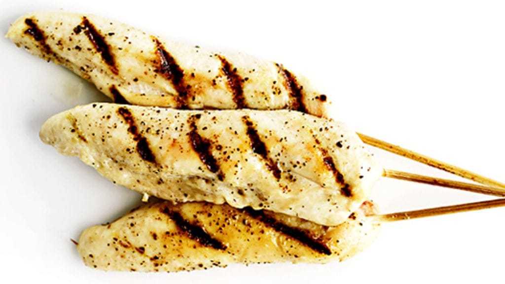 3. Kaada kanapalat marinadeineen kulhoon. Pujota lihat vartaisiin ja mausta vielä suolalla ja pippurilla. Grillaa vartaita grilliritilä melko korkealla hehkusta 6-8 minuuttia, niin että broileri tulee läpikypsäksi.