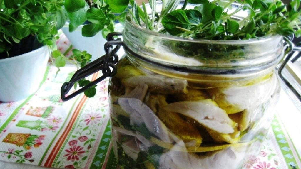 Laita puhtaan lasipurkin pohjalle pari siivua sitruunaa ja oksat kutakin yrttiä. Laita purkkiin seuraavaksi kerros silakkafileitä ja sitten taas sitruunaa ja yrttejä. Jatka kunnes purkki on täynnä.