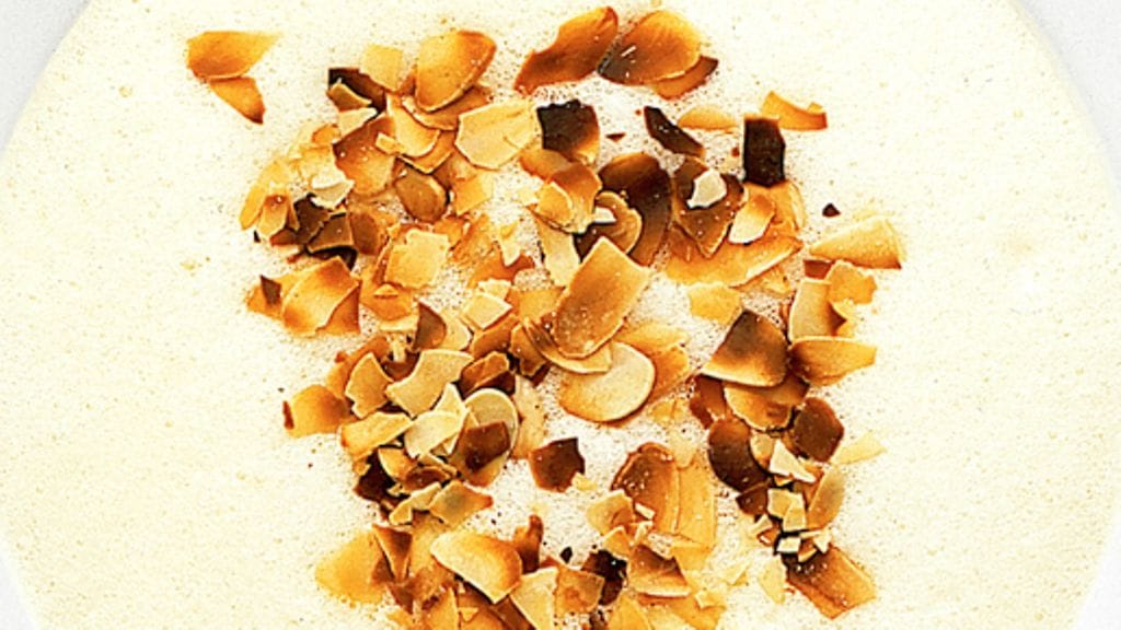 3. Tarjoa vaahto heti tai hieman jäähtyneenä lautasilta tai jalallisista laseista. Koristele paahdetuilla mantelilastuilla tai tuoreilla marjoilla.