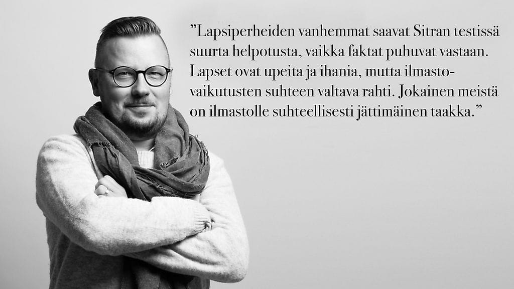 Sitran testi ampuukin ideaansa sarjatulella jalkaan. Olisi upeaa, jos ihmiset tajuaisivat arkisten valintojensa vaikutukset. Kun jokainen kolmilapsisen perheen vanhempi saa synninpäästön arjen huonoista valinnoistaan vain siksi, että talouden koko on 5 hlöä, valintojen merkitys vesittyy.