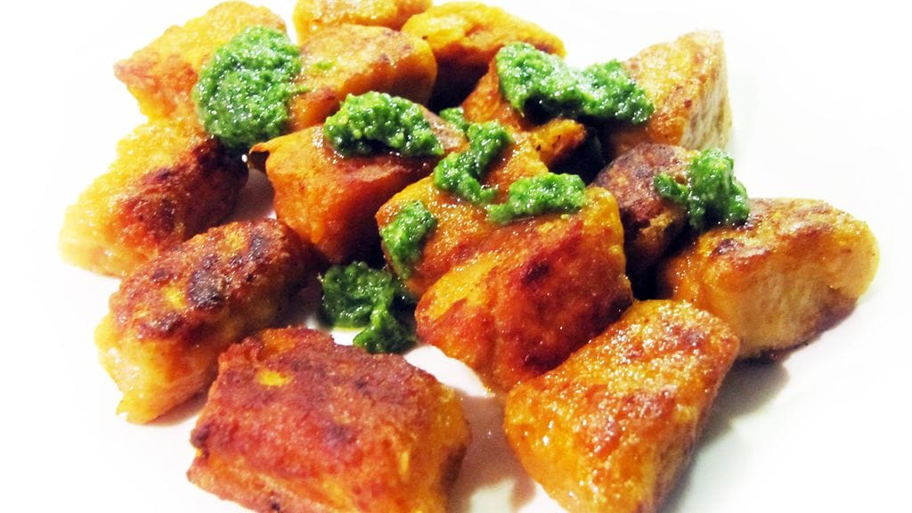 Bataatti osoittautui tällä tapaa yllättävänkin makeaksi. Raastaisin seuraavalla kerralla vielä päälle parmesaania tai lisäisin sitä pestoon ja ripottelisin annokseen paahdettuja pinjansiemeniä. Gnocchit voi vain keittää, mutta itse pidän, kun pinta sen jälkeen paistetaan rapeaksi. Katso myös klassisempi gnocchi-resepti täältä.