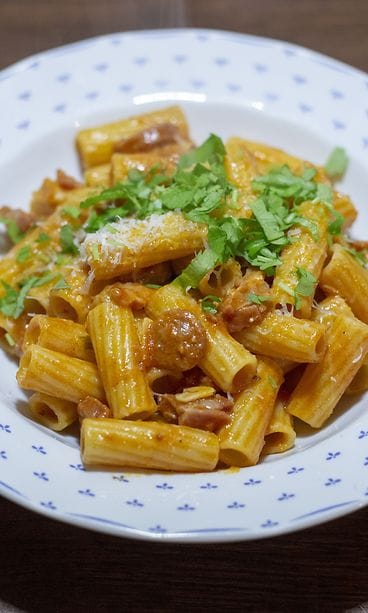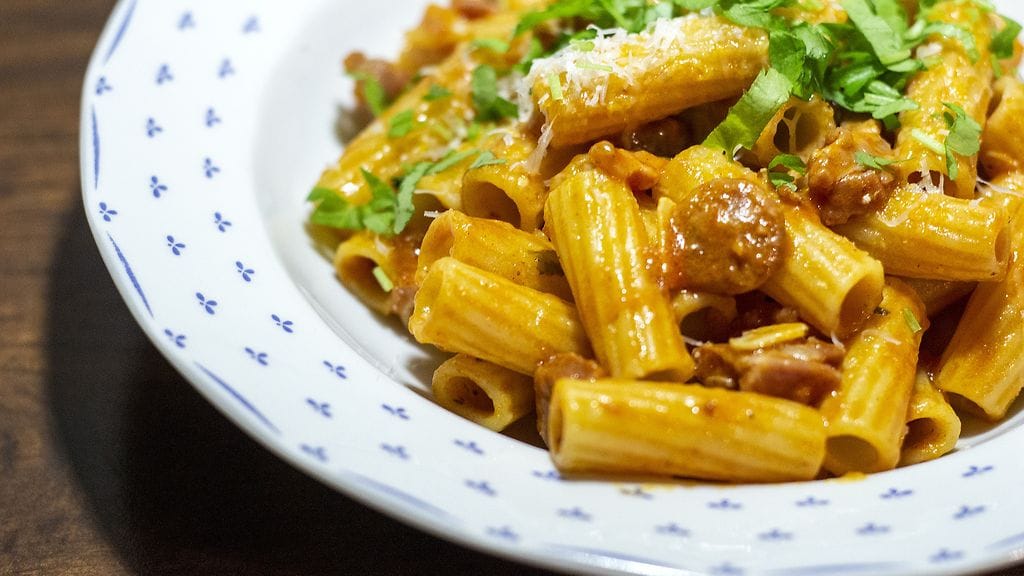 Chilinen pastakastike on täydellistä talviruokaa ja etenkin, kun korvasin hummerin ja muut merenelävät pekonilla ja salamilla. Mausta soosi maun mukaan, mutta varmista, että chili ainakin hiukan tuntuu, mutta ei polta kunnolla ja peitä muita makuja.