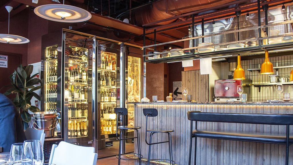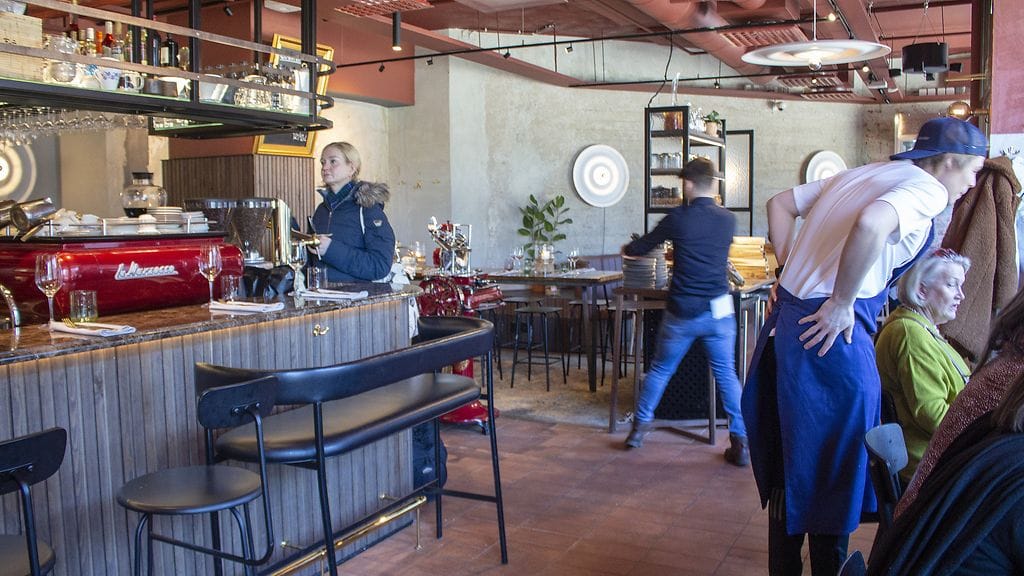 SITTEN SYÖMÄÄN. Lounaan ensimmäisinä asiakkaina mesta näyttää viihtyisältä. Looseja siellä, ikkunapöytiä täällä. Baaritiskin paikat vaikuttavat houkuttelevilta. Yleisvaikutelma on lämmin. Yksi kokki toimii tiskin takana hoidellen kylmiä ruokia. Hans saapuu paikalle ja fiilis jatkuu tiskin takanakin rennon keskittyneeltä.
